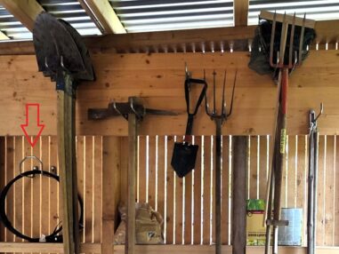 Le petit support de tuyau permet de fixer jusqu’à 50 m de tuyau d’arrosage 5/8 » (Ø 20 mm) (voir la série de photos).