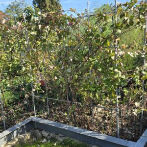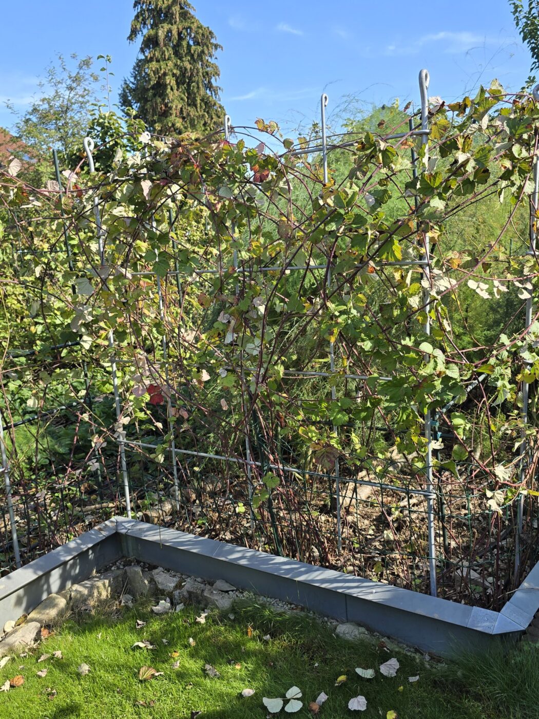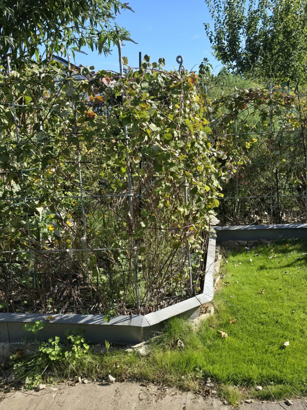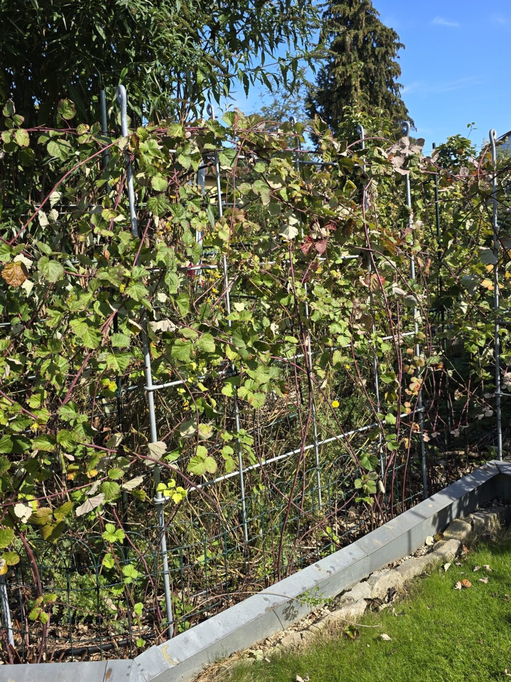 Les « fenêtres » assez grandes du treillis permettent de faire passer et de fixer très facilement les très longues tiges de la plante. Il n’est pas nécessaire de les attacher. Ainsi, les nombreuses baies peuvent être facilement récoltées en été. Je peux ensuite couper facilement les tiges fanées, les nouvelles tiges ayant déjà repoussé. Dans l’ensemble, le treillis est donc une réussite totale.