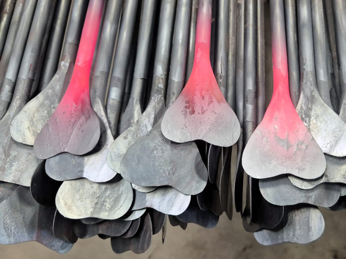 Das glühende Ende des Stabes wird unter dem Schmiedehammer in zwei verschiedenen Winkeln flach geschmiedet, bis die Herzform entstanden ist. Am unteren Ende befindet sich eine geschmiedete Erdspitze.