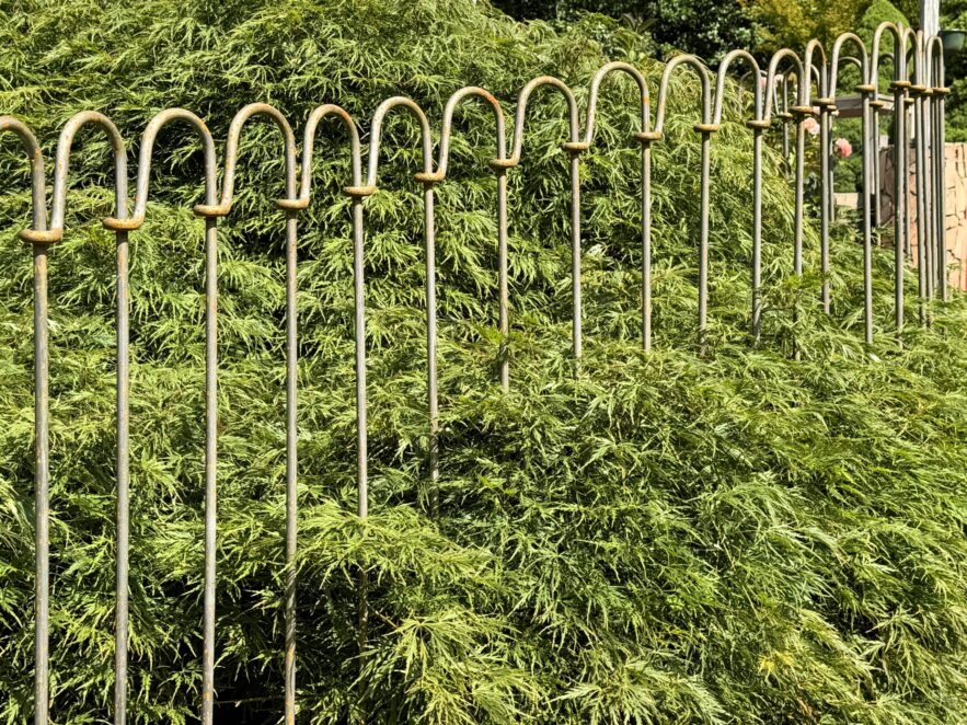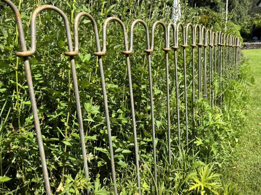 De metalen staven zijn in elkaar gestoken en in de grond verankerd en vormen samen een hek rond een kleine vijver in Frankrijk.