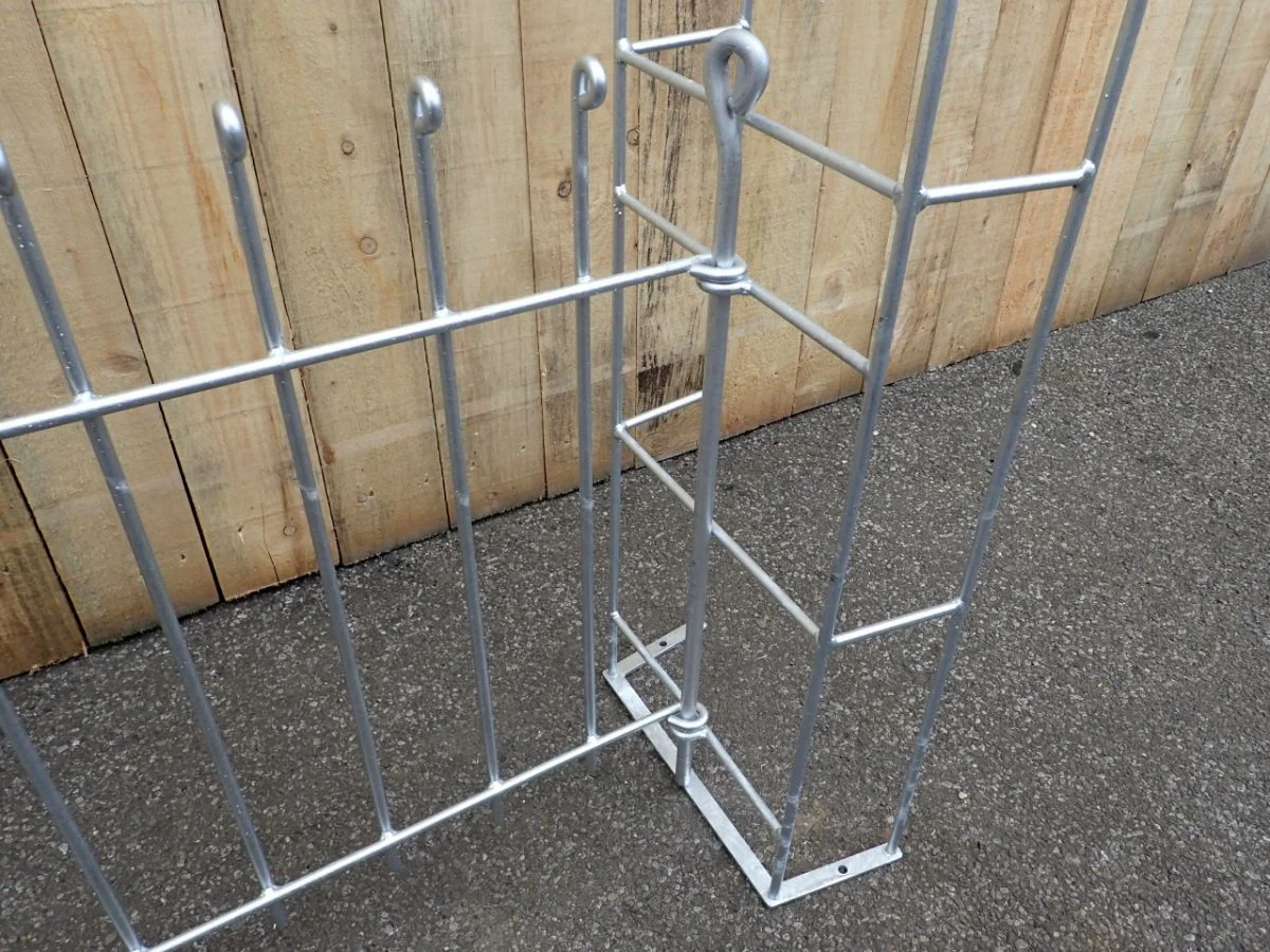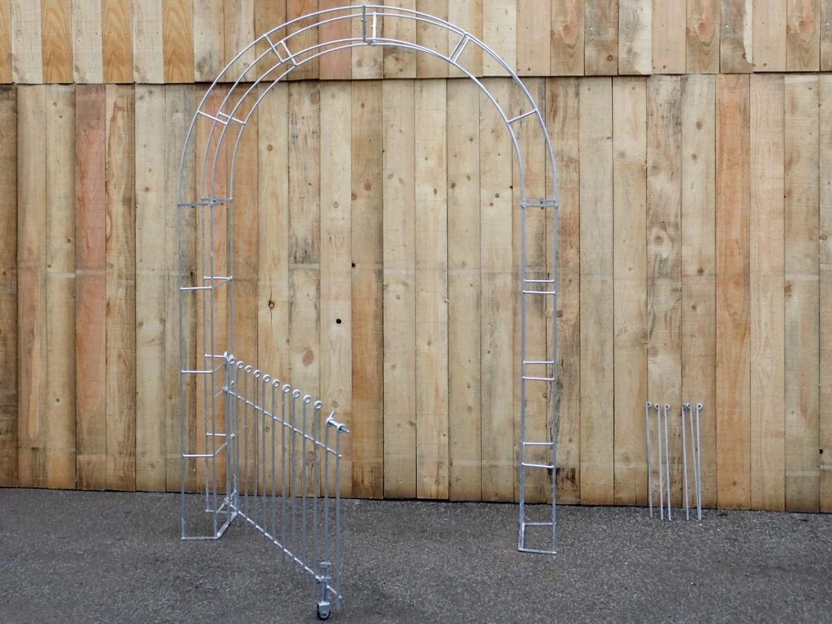 De levering omvat een rozenboog (met gelaste ogen voor de deur), een deur, zes grondankers, een verbindingsstang, een veergrendel en een grondrol.