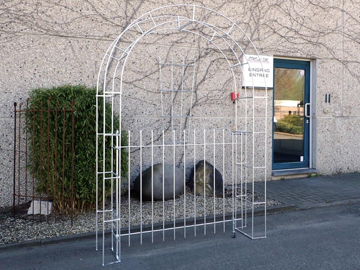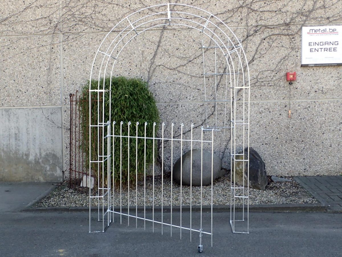 De deur is 129 cm breed. De doorgangsbreedte van de rozenboog is 128 cm.