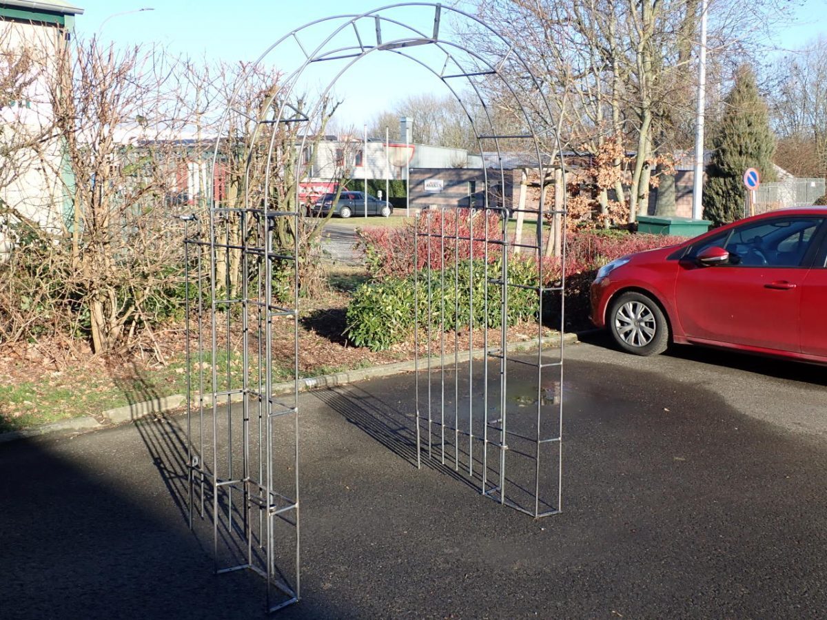 Rozenboog: rondstaal Ø 1,0 cm en platstaal 2×0,5 cm.