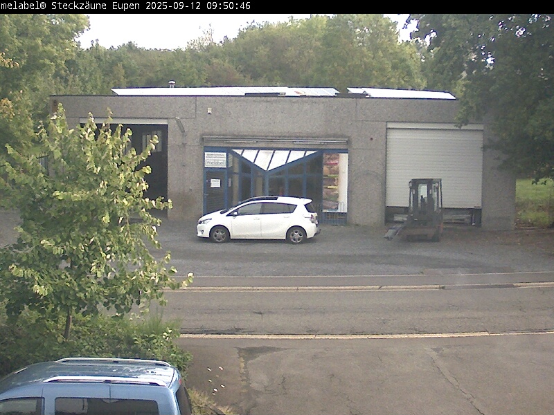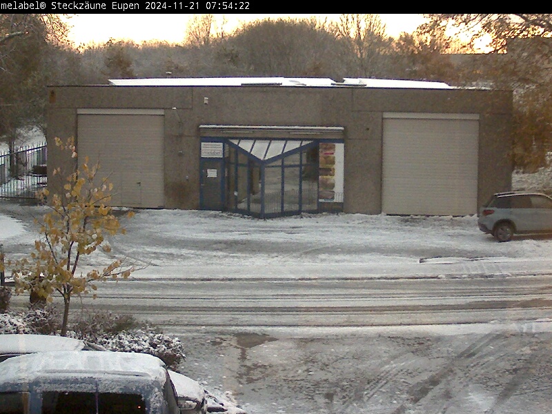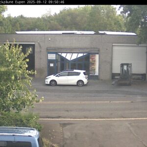 Voordat we naar de andere kant van de straat verhuisden. De webcam richtte zich zijdelings op onze tentoonstelling van schuttingpanelen in westelijke richting. Op de voorgrond ziet u een deel van onze tentoonstelling van schuttingpanelen, rechts twee essen, op de achtergrond de Euregiostraße en de gebouwen van onze buren.